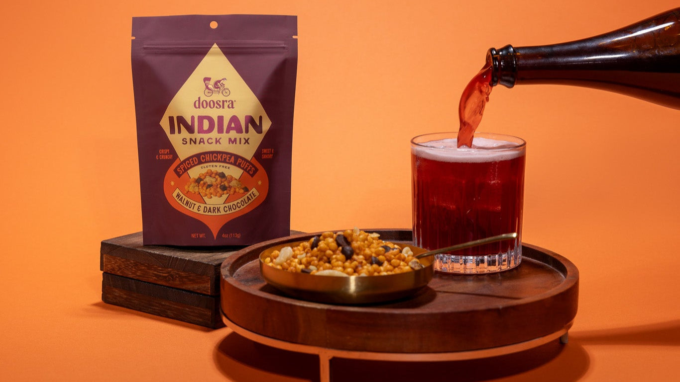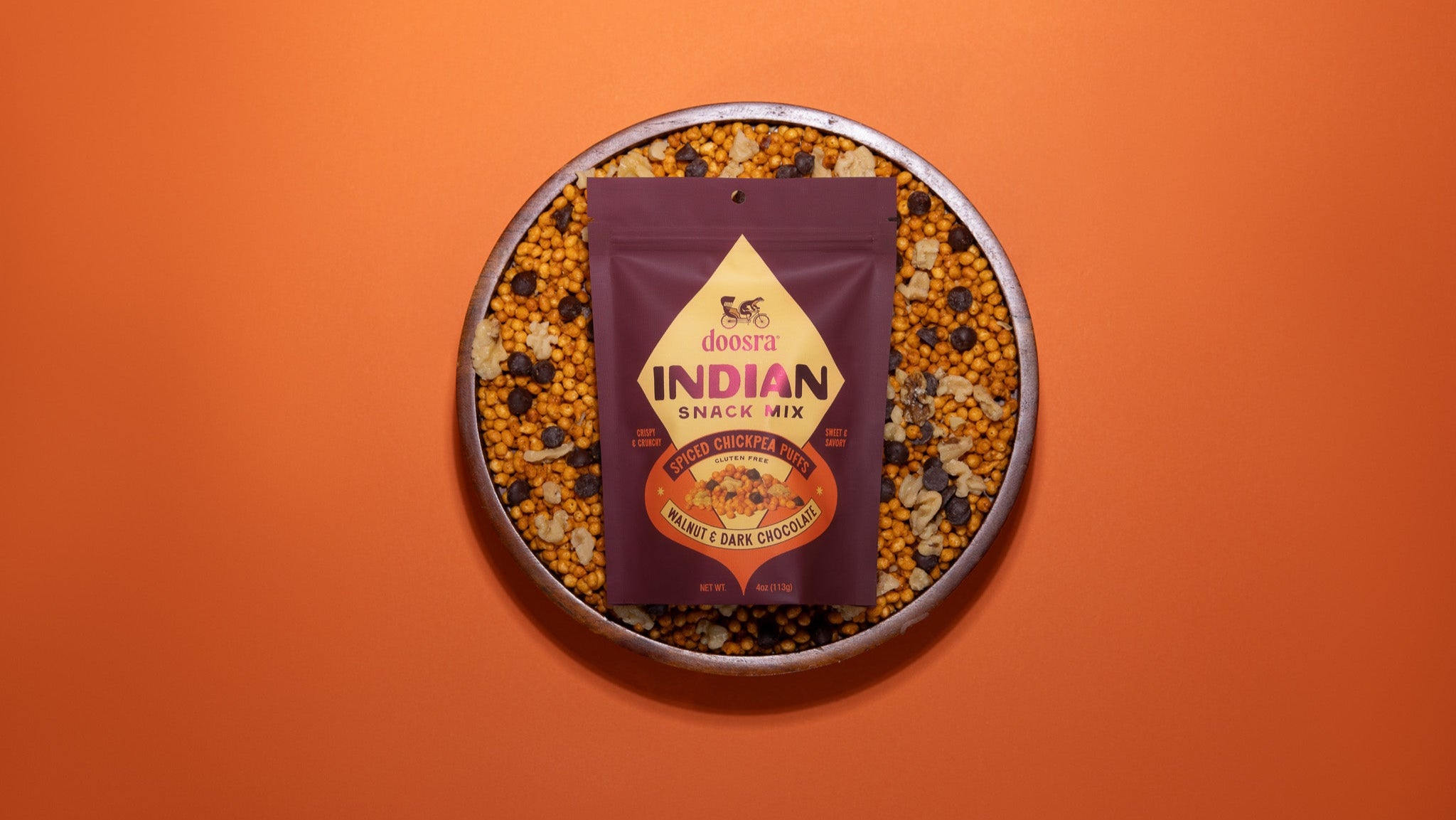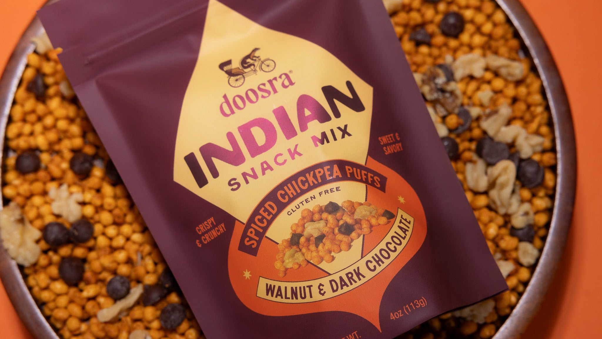 Ingredients: Chickpea Puffs (Chickpea Flour, Water, Non-GMO Expeller Pressed Canola Oil, Salt), Walnuts, Organic Dark Chocolate (Organic Cane Sugar, Organic Chocolate Liquor, Organic Cocoa Butter), Spices (Dried Green Mango, Black Salt, Kashmiri Chili, Roasted Cumin, Roasted Coriander, Asafoetida)